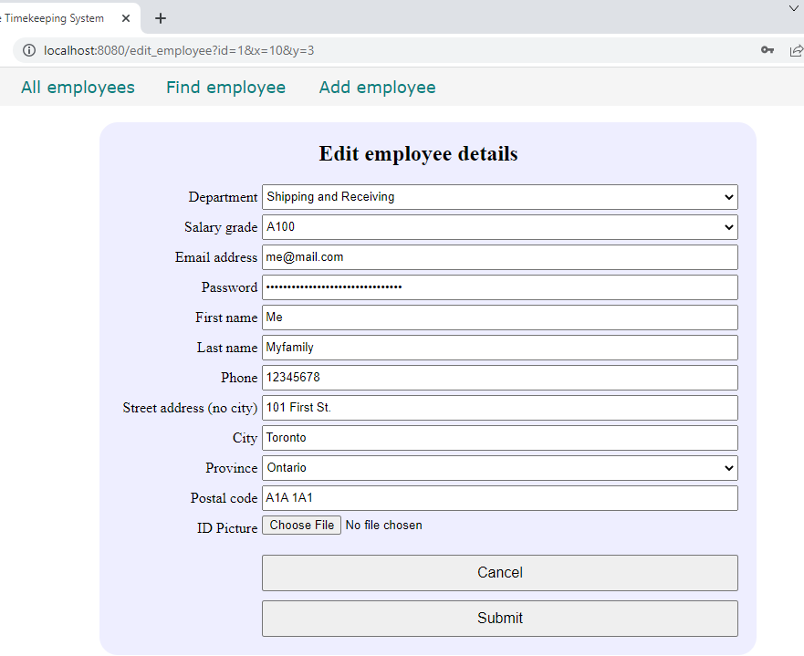 First, we need to retrieve the record to be edited. There is an **id** field in the **employees** table that has a unique number for each row, and this field is used to identify the row (being the primary key).